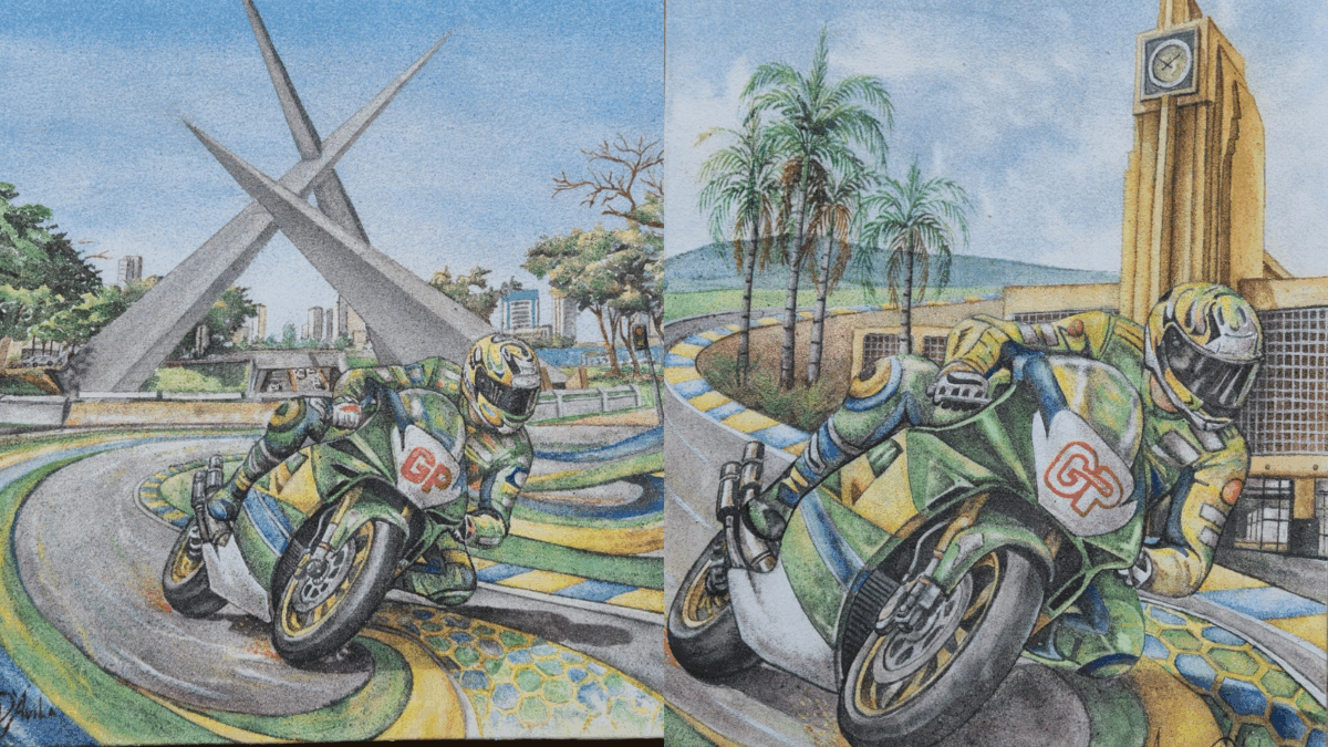 Auriovane D’Ávila cria obras em areia colorida que dialogam com o MotoGP, entregues ao CEO da categoria pelo governador Ronaldo Caiado.