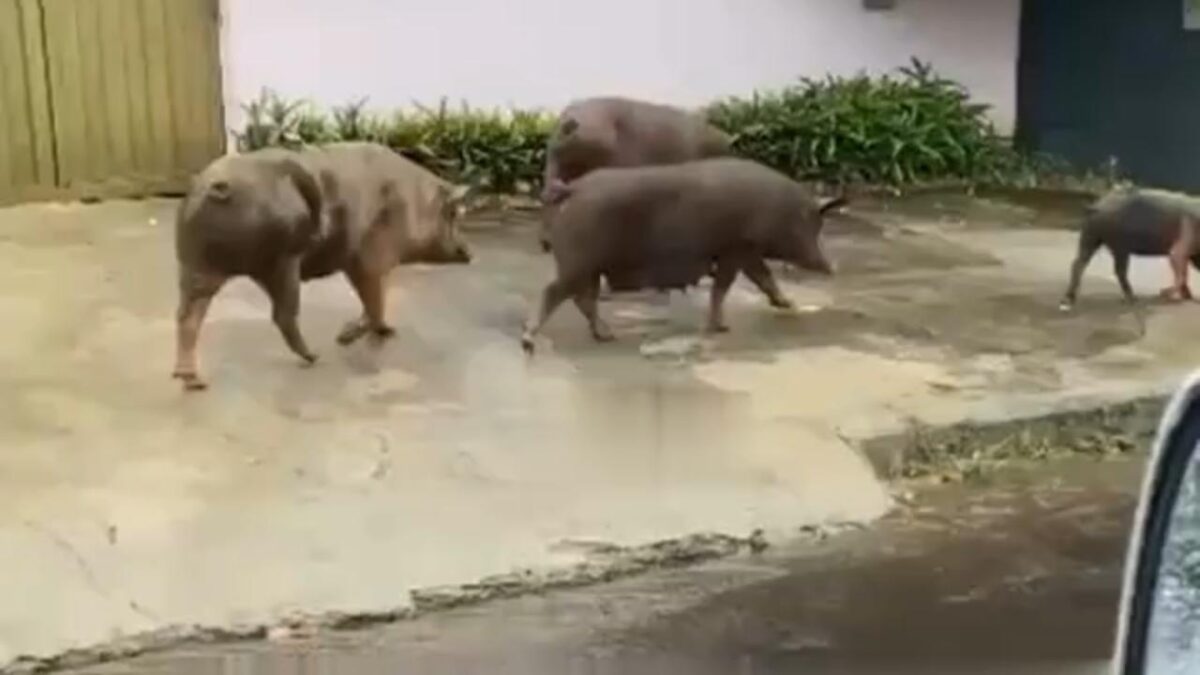 Porcos de chacareiro são vistos circulando livremente em busca de alimento nas ruas do Setor Santa Genoveva, em Goiânia.