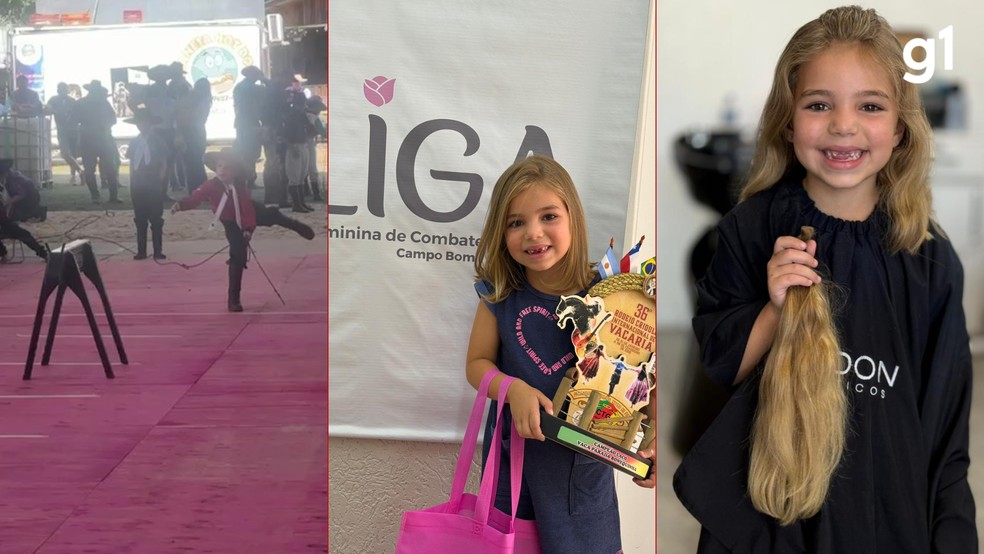 Antônia Silveira Ritter, laçadora de 5 anos, doa cabelos à liga de combate ao câncer no RS após vitória no Rodeio de Vacaria. Gestos nobres emocionam a todos.