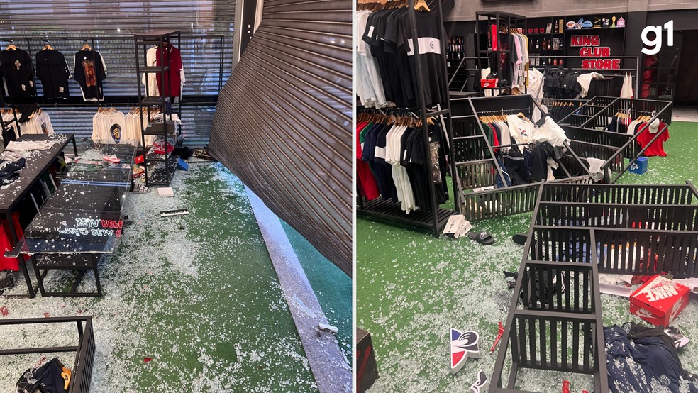 Criminosos usam carro para arrombar loja em Porto Alegre, furtando roupas de marcas conhecidas. Prejuízo chega a R$ 20 mil, conforme proprietário.