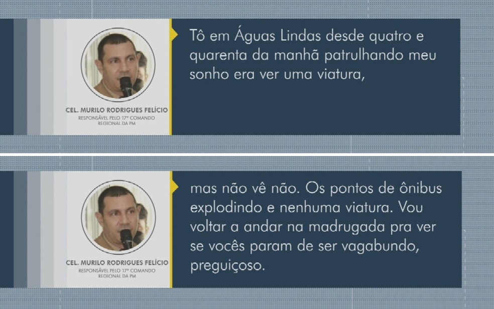 Coronel cobra policiamento em Águas Lindas de Goiás durante a madrugada e declara que é um absurdo não encontrar viaturas nas ruas. Áudio vazou e foi retirado de contexto. Polícia Militar vai apurar o caso.