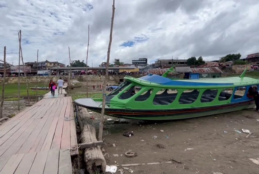 Em Tabatinga, a 1.100 km de Manaus, navios não conseguem atracar no porto. As embarcações precisam parar mais longe, onde ainda há água. Quem depende do transporte fluvial usa uma ponte que, em condições normais, estaria coberta pelo rio.