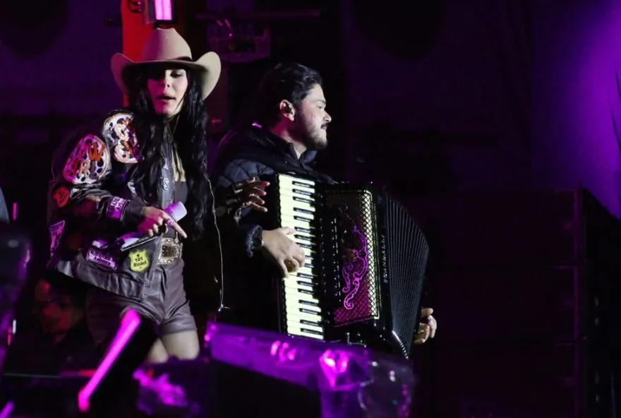 Grande atração do primeiro dia da Taça Universitária de São Carlos, a boiadeira subiu ao palco pontualmente à meia-noite ao som do sucesso “Olha onde eu tô”. Bastou o refrão do hit para que o público, ainda firme nas primeiras horas da madrugada, cantasse junto em coro.