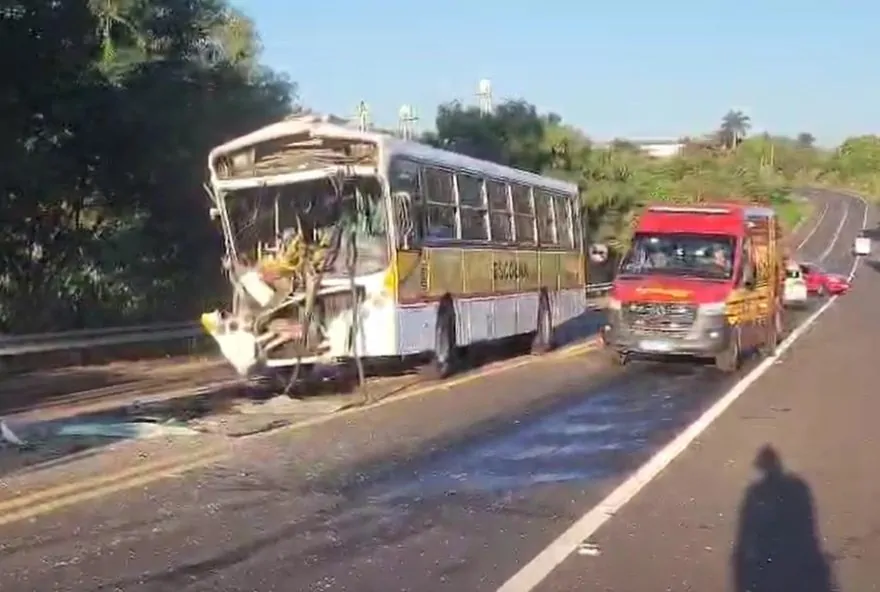 Um ônibus escolar bateu na traseira de um caminhão bitrem e mais de 10 pessoas tiveram ferimentos leves, na manhã desta quinta-feira (20), no quilômetro 18,6 da rodovia Prefeito Homero Correa Leite, em São José do Rio Pardo.