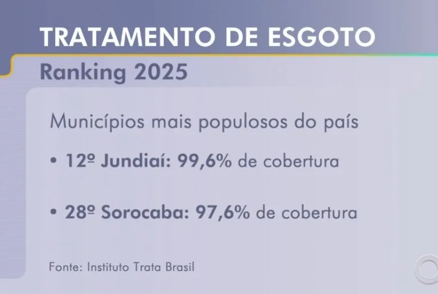 Sorocaba e Jundiaí estão entre as 30 cidades com melhor tratamento de esgoto no país. Os municípios aparecem entre os 30 melhores do Instituto Trata Brasil. Jundiaí (SP) está à frente até da capital paulista, com uma cobertura de 99,6%.