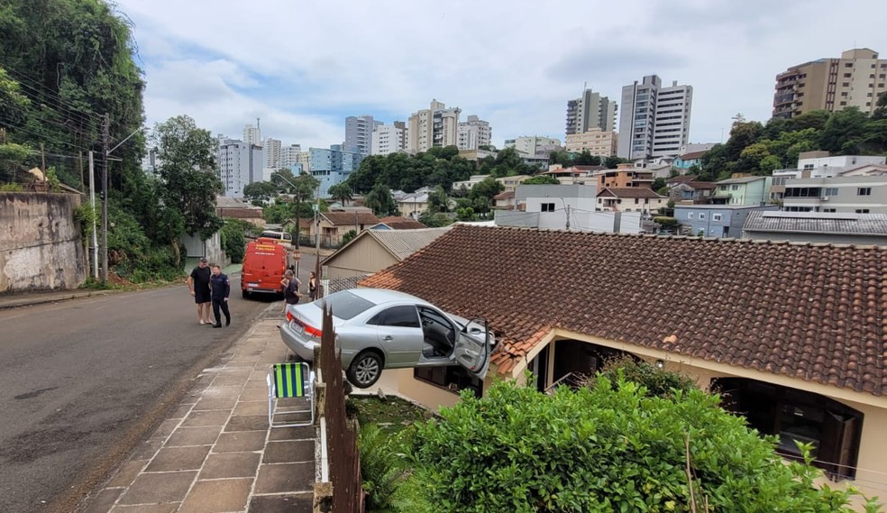 Carro desgovernado em Erechim: veículo fica suspenso entre calçada e telhado