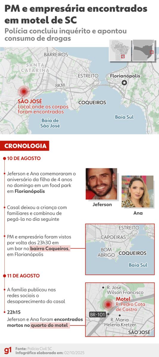 Investigação revela detalhes da morte de PM e empresária em motel: intoxicação, drogas e alta temperatura na água da banheira.