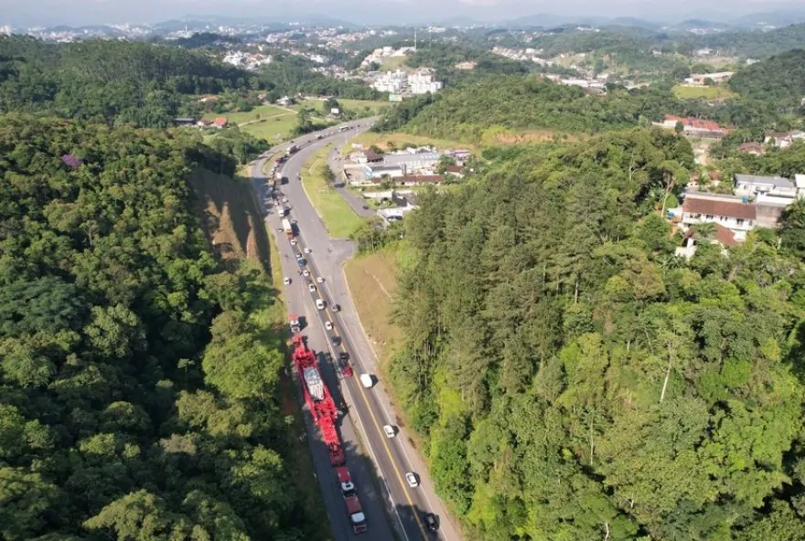 Antes mesmo de percorrer a BR-470, o comboio já impactava o trânsito na região, no km 51 da rodovia. Durante a manhã, curiosos reduziam a velocidade, que ficou em torno de 20 km/h. Por conta da proporção da carga, o caminhão ocupa boa parte da rodovia ao longo do percurso e, em alguns trechos, precisará transitar na pista contrária, segundo a Polícia Rodoviária Federal (PRF). A previsão é de que a carga chegue no destino final às 16h.