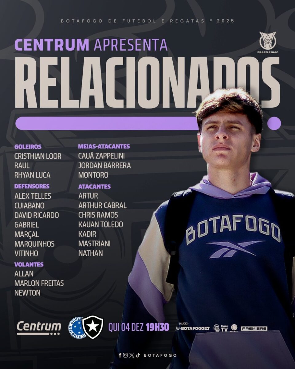 Desfalques aumentam no Botafogo para partida contra o Cruzeiro. Montoro relacionado, mas Savarino, Corrêa e mais jogadores estão fora. Saiba mais.