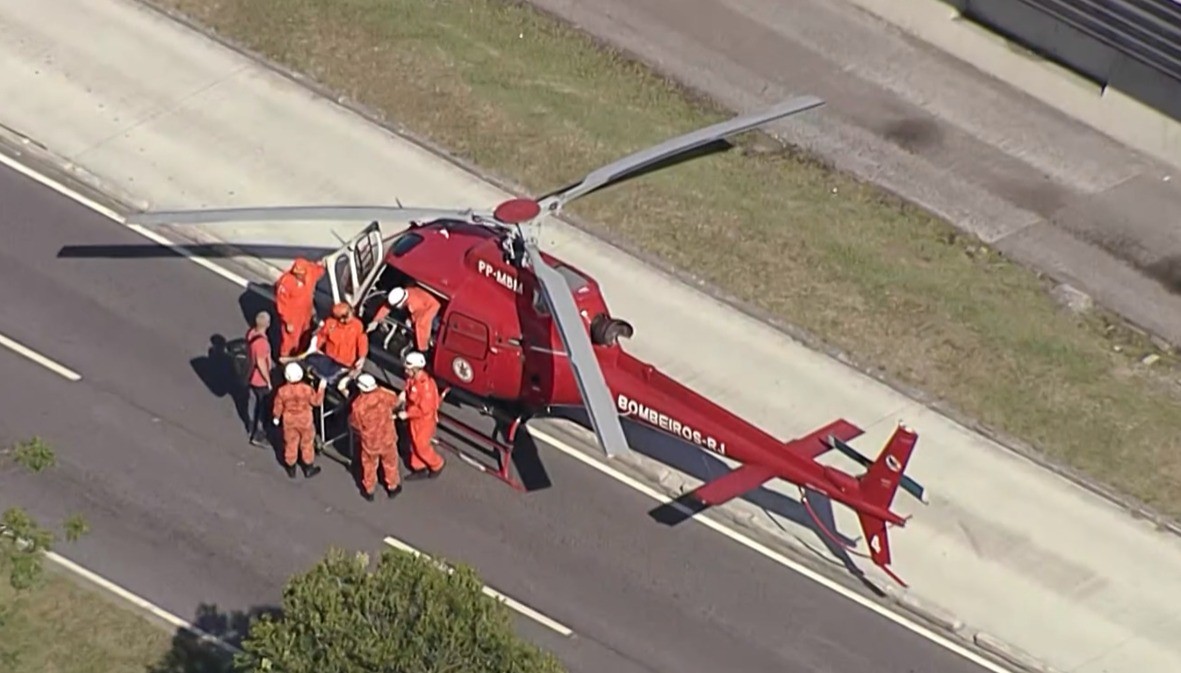 Helicóptero do Corpo de Bombeiros resgata vítima em estado grave de acidente na Avenida das Américas. Ação rápida e eficiente garante segurança e mobilidade no local.