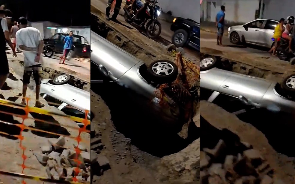 Carro cai em buraco em Feira de Santana, Bahia, durante obra. Motorista saiu ileso. Moradores pedem solução para evitar novos acidentes. Confira!