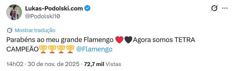 O ex-jogador Lukas Podolski parabeniza o Flamengo pela conquista da Libertadores. Juntamente com outros astros, ele celebra o tetra rubro-negro com mensagens emocionadas.