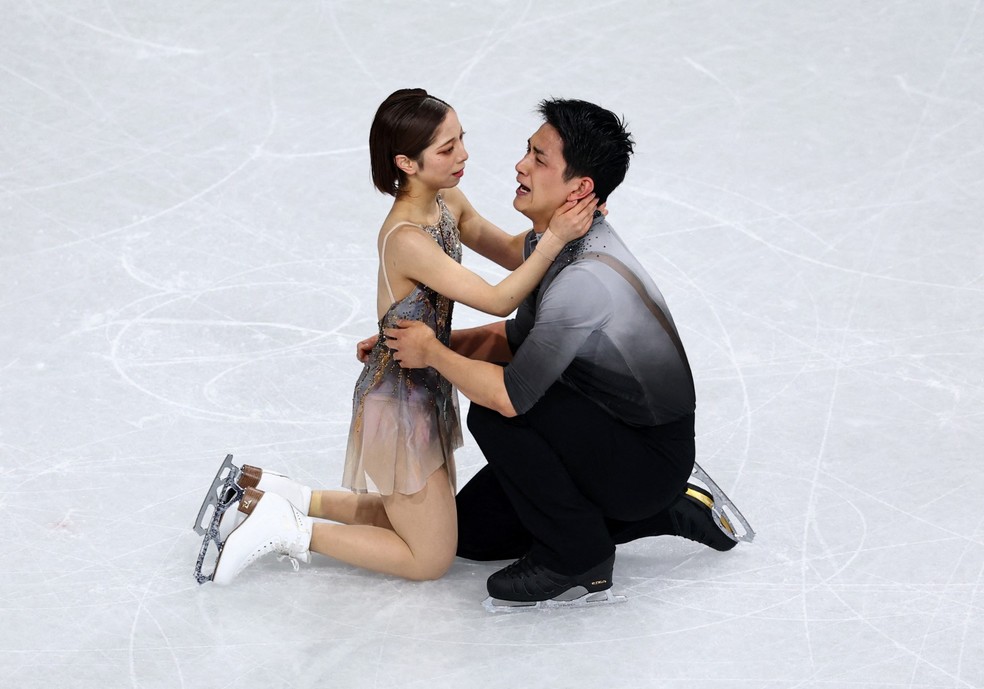 Patinadora japonesa emociona com reações fofas ao conquistar ouro na patinação em pares