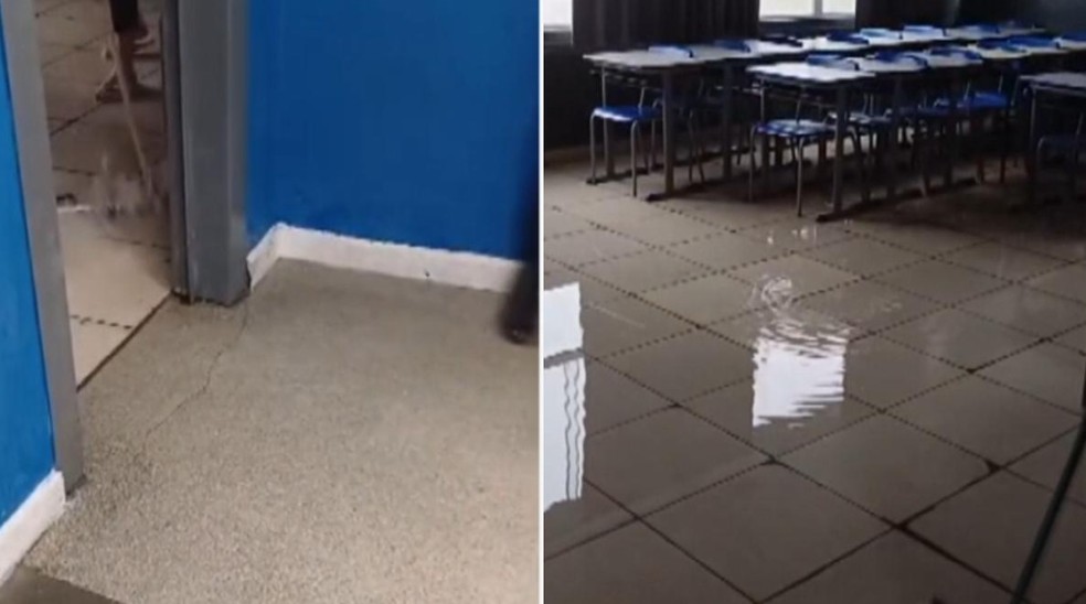 Professores e alunos usam rodos para limpar salas de aula alagadas no Paraná. Temporal causa estragos em escolas da região. Saiba mais!
