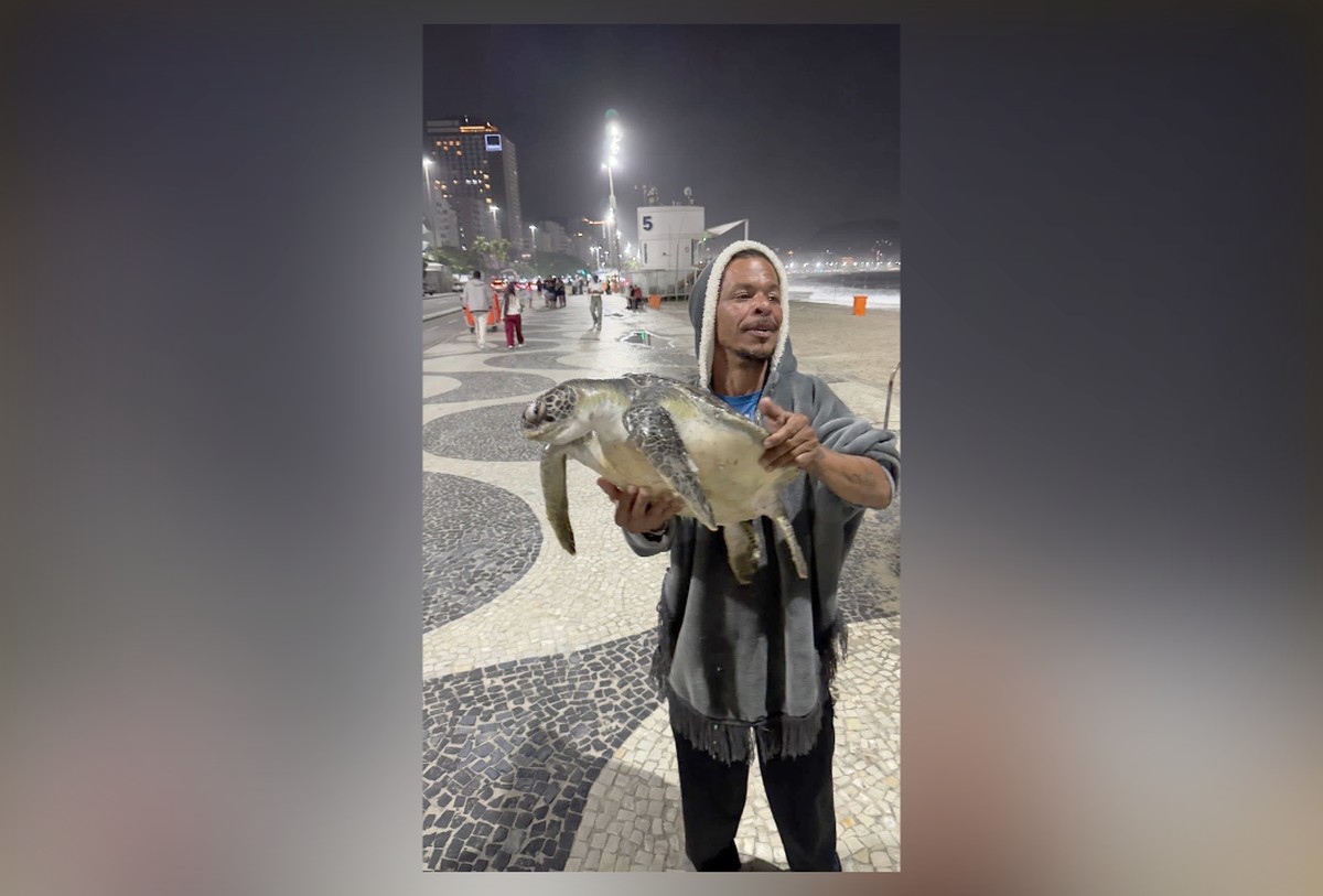 Homem é visto com tartaruga marinha na Praia de Copacabana: a importância da proteção da fauna marinha