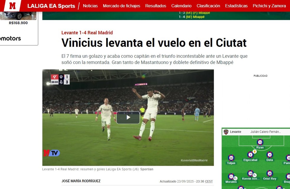 Vinicius Junior brilhou com golaço e assistência na vitória do Real Madrid sobre o Levante. Jornais espanhóis destacam atuação do brasileiro ao lado de Mbappé. Próximo desafio é contra o Atlético de Madrid.