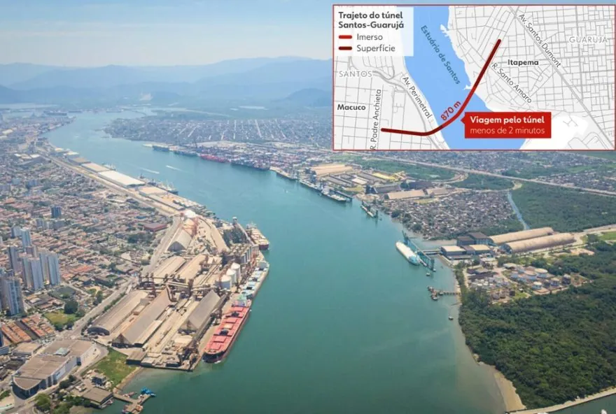 O túnel Santos-Guarujá, o primeiro túnel imerso do Brasil, terá 1,5 quilômetro de extensão, com investimento total estimado em R$ 6,8 bilhões. O contrato prevê prazo de 30 anos, incluindo construção, operação e manutenção, com previsão de início das obras em 2027. O Governo do Estado indica que o projeto foi estruturado conforme o modelo de concessão, com base no edital publicado em 2025, e destaca a colaboração entre Estado e União no processo.