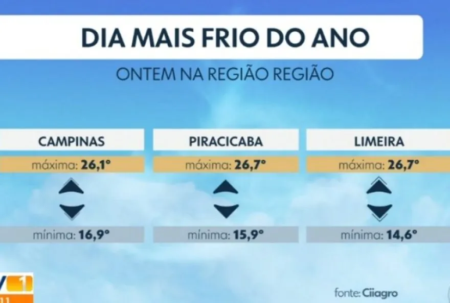 Em Piracicaba, as máximas e mínimas registradas foram de 15,9°C e 26,7°C, respectivamente. Já em Limeira, as temperaturas ficaram entre 14,6°C e 26,7°C, conforme os dados do Centro Integrado de Informações Agrometeorológicas (Ciiagro).