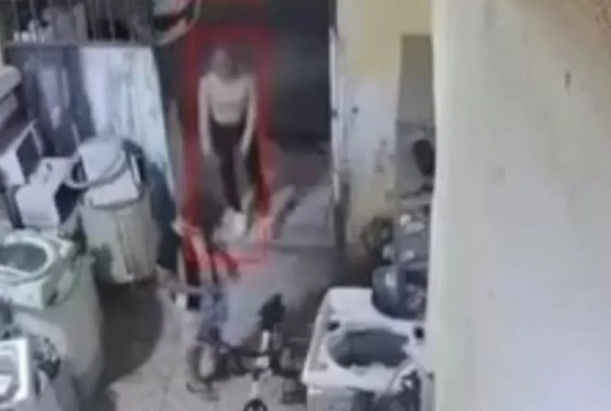 A câmera de segurança do imóvel registrou o momento que uma mulher chegou em um carro, se aproximou do garoto e perguntou onde estava a mãe dele.