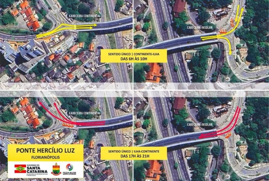 Durante os testes, que ocorrerão das 6h às 10h e das 17h às 21h, as duas faixas da ponte terão sentido único para o Centro pela manhã e para o bairro no final da tarde. Segundo a secretaria, estudos técnicos foram realizados para a reversão do trânsito na Ponte Hercílio Luz, que é um cartão-postal símbolo de Florianópolis e passará por essa experiência inovadora.