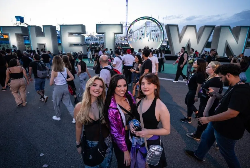 Público do The Town posa para fotos diante do letreiro na entrada do festival no