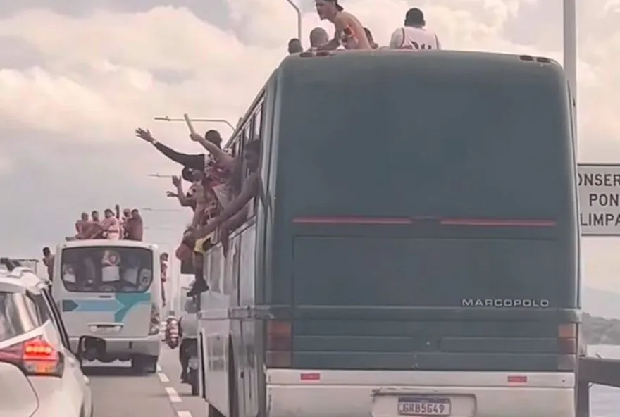 Torcedores do Flamengo são flagrados viajando no teto de ônibus na Ponte Rio-Niterói