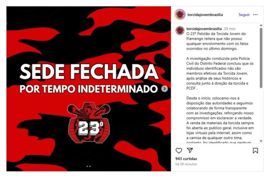 A Torcida Jovem do Flamengo, após o trágico episódio da morte do vascaíno Eumar Vaz, decidiu fechar a sede em Samambaia por tempo indeterminado. Em uma nota publicada nas redes sociais do local nesta quarta-feira (24), a torcida afirmou que o momento não oferece o ambiente adequado para torcer e, em respeito à família do torcedor falecido, o 23º Pelotão permanecerá fechado até segunda ordem.