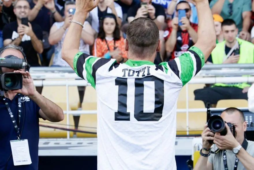 Totti marca golaço no meio de campo em amistoso com lendas do futebol italiano; assista agora