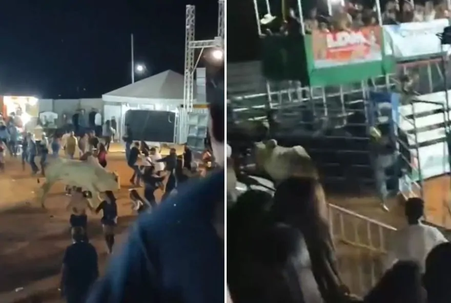 O caso aconteceu na sexta-feira (9). No vídeo, enquanto algumas pessoas correm e desviam do animal, outras sobem nas grades da plateia e da arena do rodeio para evitar serem atingidas pelo touro, que acaba voltando para o curral.