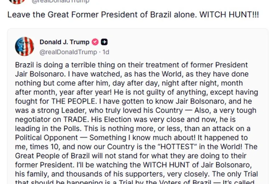 Na segunda-feira (7), Trump já havia feito uma postagem defendendo o ex-presidente. O republicano disse que Bolsonaro é alvo de perseguição, também na Truth Social. Nessa nova manifestação, Trump compartilhou o post anterior.