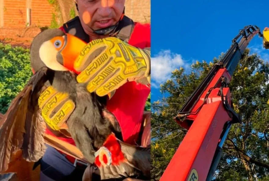 Um tucano foi resgatado nesta sexta-feira (23), em Assis (SP), depois de se enroscar em uma linha de pipa no alto de uma árvore e não conseguir se soltar sozinho.