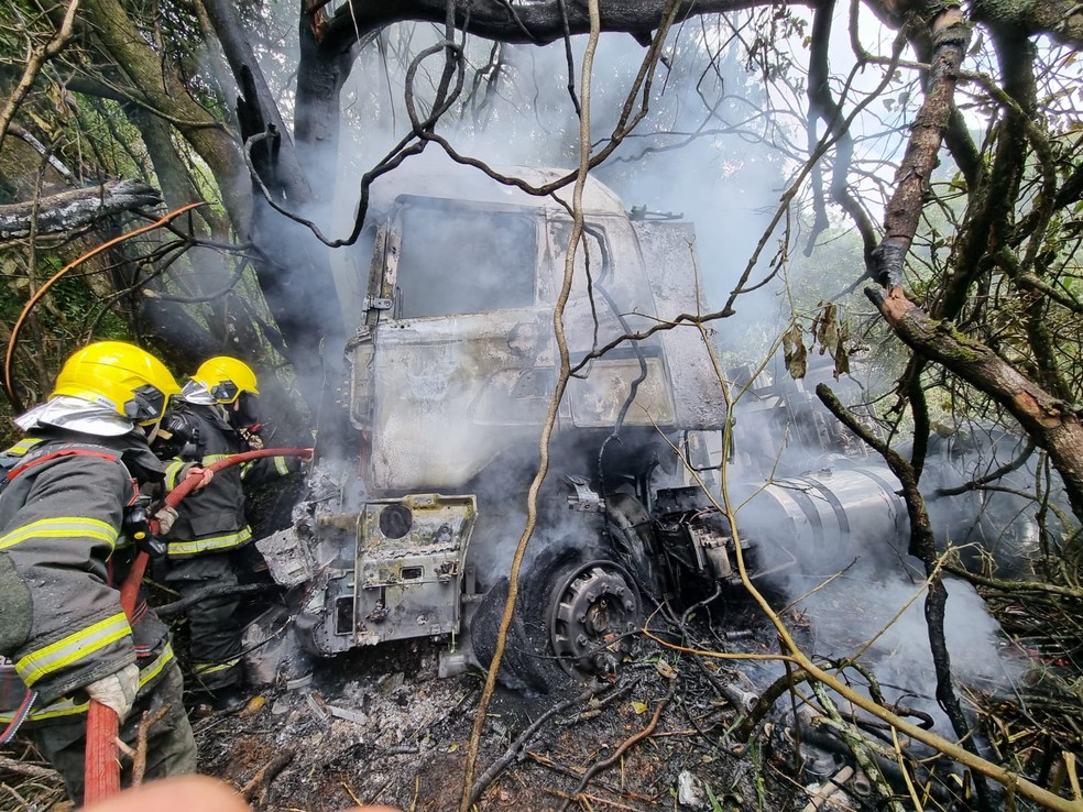 Carreta pega fogo após desviar de ultrapassagem na BR-265. Motorista perdeu controle, desceu barranco e bateu em árvore. Segurança no trânsito é fundamental.