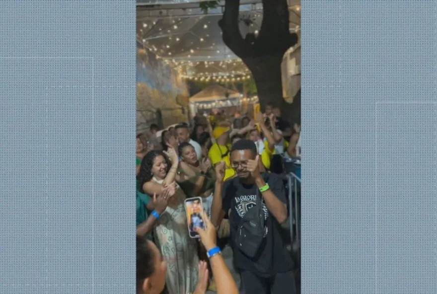 Igor foi recebido com aplausos, abraços, bolo e música por colegas e clientes do bar. O universitário não segurou a emoção ao ser calorosamente recebido pelos presentes.
