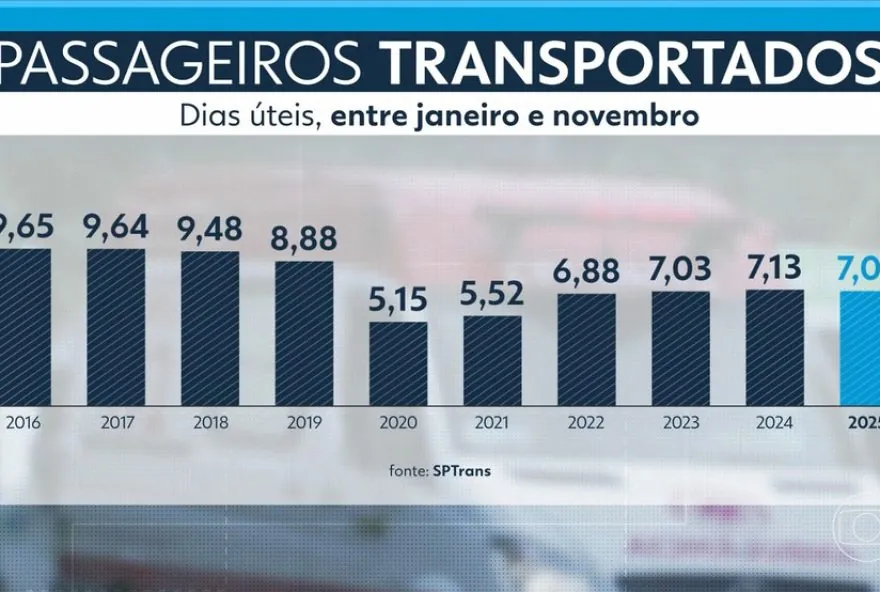 Antes da pandemia, o sistema de ônibus da capital transportava um volume próximo de 9 milhões de passageiros. Em 2020, esse número despencou e, apesar de uma recuperação gradual a partir de 2021, nunca retornou ao patamar anterior. Entre 2021 e 2024, houve crescimento ano a ano no uso dos ônibus. Mas, de 2024 para 2025, o movimento nas catracas voltou a cair, segundo os dados oficiais da SPTrans.