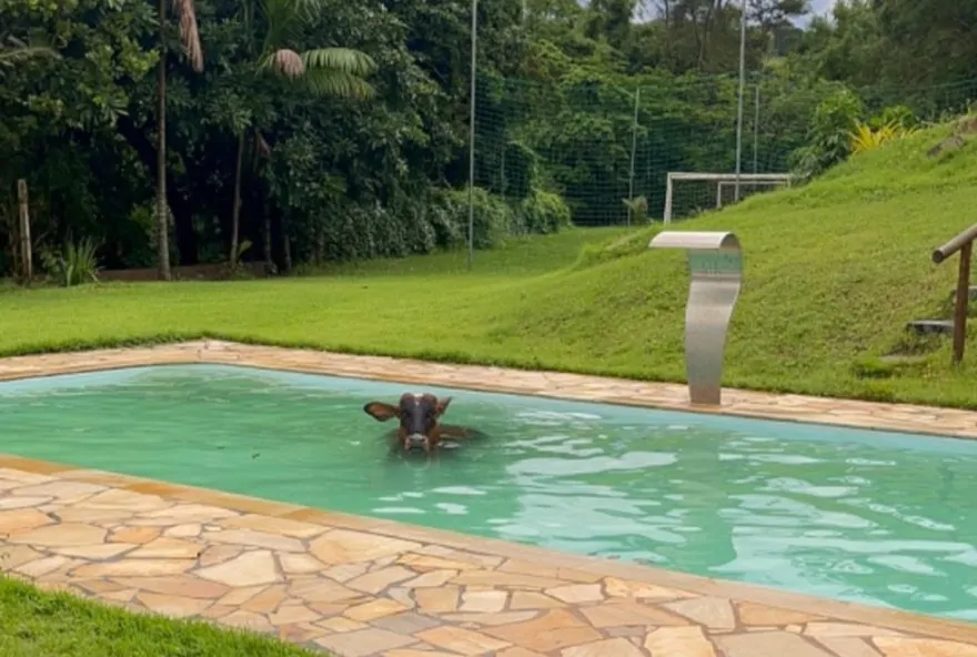 Os últimos dias têm sido de altas temperaturas em várias partes do país e uma das alternativas para se refrescar é curtir uma piscina. Em Guarani, na Zona da Mata mineira, o empresário João Mendes foi surpreendido ao se deparar com a vaca garrotinha dele na piscina do sítio da família.