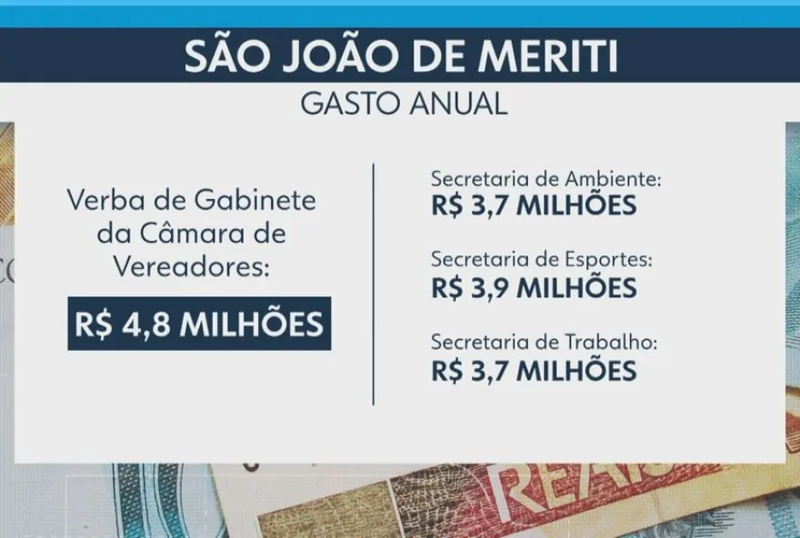 Essa verba também pode ser utilizada em despesas como edição de jornais, livros, consultorias, aluguel de imóveis e veículos. Em um período de um ano, o montante gasto apenas com a verba de gabinete chega a quase R$ 5 milhões em São João de Meriti, ultrapassando os investimentos realizados em várias secretarias do município.