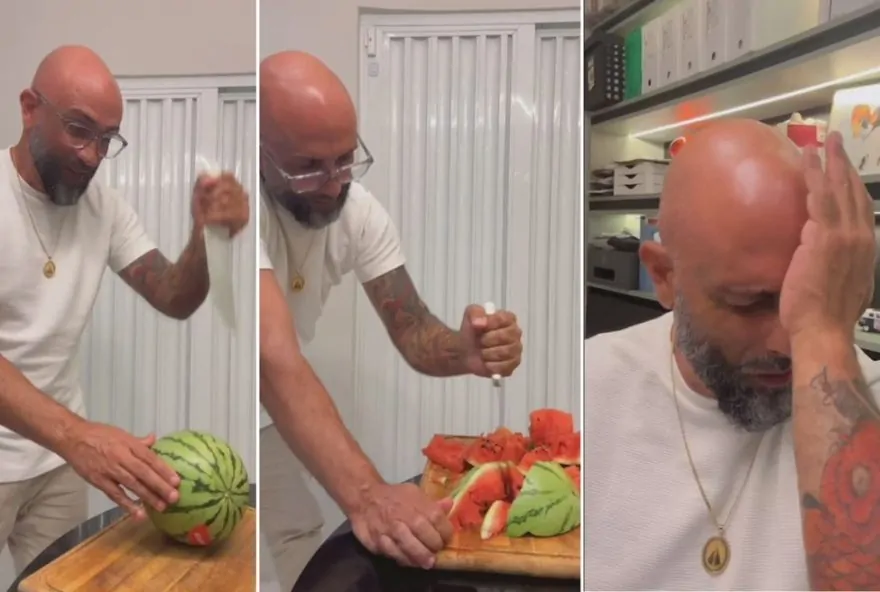 Vereador esfaqueia melancia e chama de mentirosa irmã acusada de matar Igor Peretto: ‘Viu agonizando’