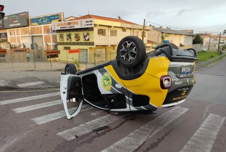 Dois policiais militares ficaram feridos após um carro atingir a viatura em que estavam, que capotou em uma avenida de São José dos Pinhais, na Região Metropolitana de Curitiba (RMC).