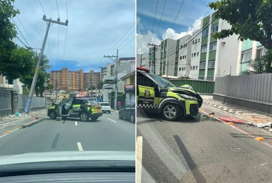 Poste fica pendurado e agente passa mal após batida com viatura do órgão de trânsito de Salvador