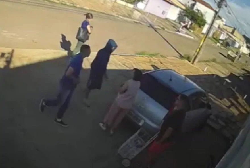 O crime, registrado por câmeras de segurança, mostra o momento em que as vítimas foram abordadas e o veículo levado pelos suspeitos.