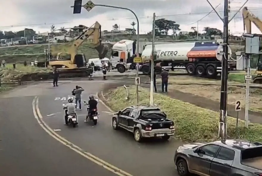 VÍDEO: caminhão-tanque é atingido e arrastado por trem ao tentar cruzar ferrovia, no Paraná