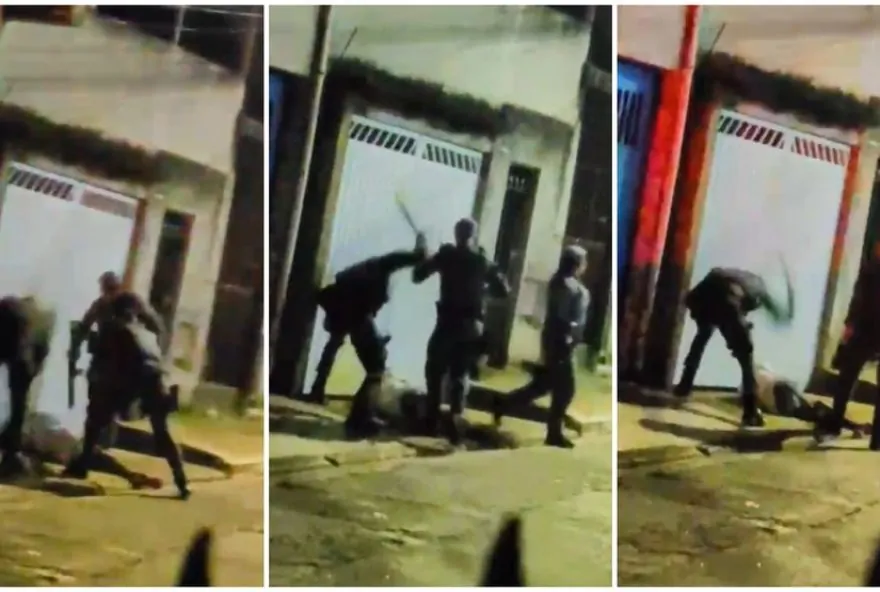 Nas cenas capturadas pela TV Globo, é possível ver o homem no chão e cercado pelos policiais, sendo espancado com violência. Enquanto um dos agentes utiliza o cassetete de maneira contínua, outro desfere chutes na região do abdômen, em uma clara demonstração de abuso de poder e violência gratuita. Surpreendentemente, um terceiro PM observa a cena sem intervir, com uma arma longa em mãos.