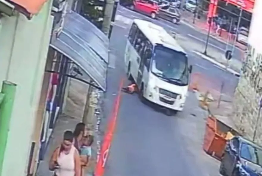 Vídeo flagra momento em que micro-ônibus atropela menino em bicicleta e por pouco não passa por cima dele