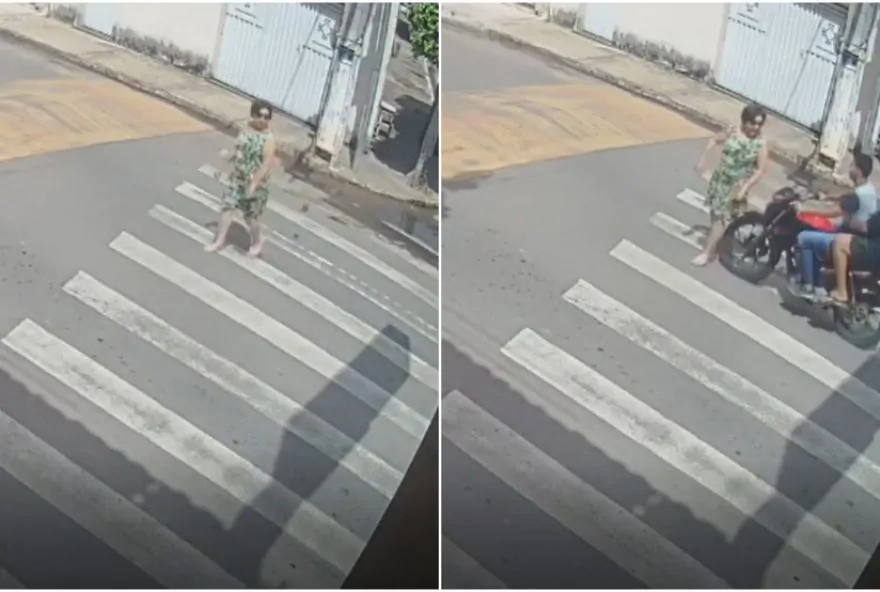 Câmeras de segurança flagraram o momento do acidente. Nas imagens, é possível ver a idosa observando o movimento nos dois sentidos da via antes de iniciar a travessia. Em seguida, ela foi atingida por uma motocicleta.