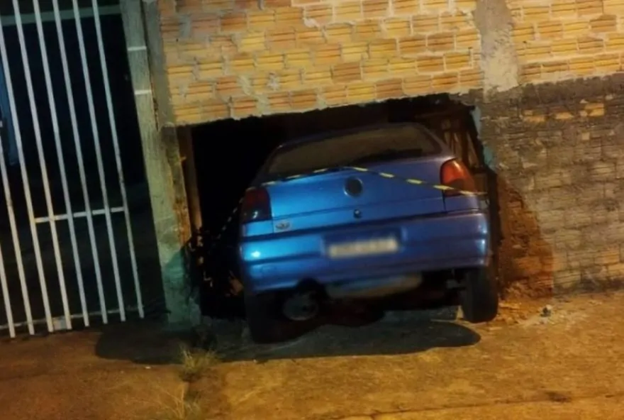 Com o impacto da batida, o carro atravessou a estrutura – e só não atingiu a casa porque ficou com a parte traseira presa em tijolos. Nenhum morador foi atingido.