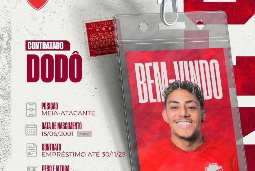 O Vila Nova, clube de futebol brasileiro, anunciou nesta quarta-feira a contratação do meia Dodô, de 23 anos de idade. O jogador, que teve uma boa temporada na Ponte Preta, chega emprestado pelo Coimbra-MG e assina contrato com o Tigrão até o final de 2025. Dodô é conhecido por sua habilidade e versatilidade em campo, características que chamaram a atenção da equipe de Goiás.