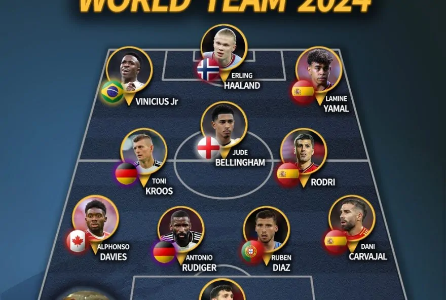 A formação da seleção de 2024 da IFFHS segue o tradicional esquema tático 4-3-3, com o espanhol Rodri atuando como único volante no meio-campo. Os dois meio-campistas escolhidos foram Kroos e Bellingham, completando assim o setor de criação da equipe. No ataque, ao lado do brasileiro Vini Jr., estão Haaland e Yamal, formando um trio ofensivo poderoso e habilidoso.
